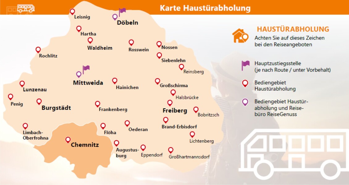 Wir bieten Ihnen für viele Reisen die kostenlose Abholung vor Ihrer Haustür, wenn Sie innerhalb des markierten Gebietes wohnen (siehe Karte). Bei Orten außerhalb der Markierung wenden Sie sich an unsere Mitarbeiter der Reisebüros.